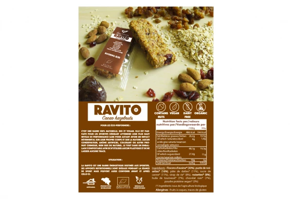 La ravito est une barre naturellement énergétique. Son emballage compostable ‘easy push’ est super simple à ouvrir à une main. Ses ingrédients sont bio, vegan et nous la préparons artisanalement en Belgique (Pour 100g) Énergie : 486Kcal Matières grasses : 26,2g Dont acides gras saturés : 4g Glucides : 48,1g Dont sucres : 27,4g Protéines : 10g Sel : 0,05g