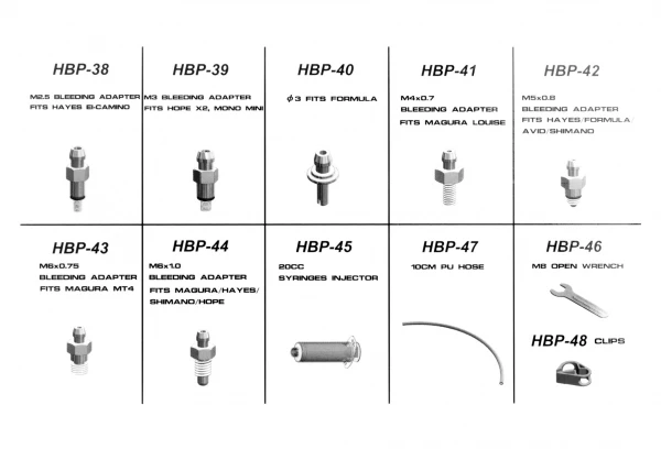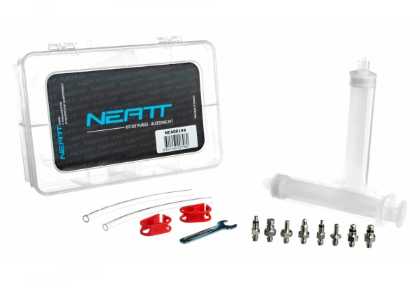 Ce kit de purge Neatt offre la possibilitĂ© de purger un grand nombre de modèles de freins grâce aux nombreux adaptateurs fournis dans ce pack. Pour un prix raisonnable, il bĂ©nĂ©ficie d’une compatibilitĂ© avec les freins des marques Magura, Hayes, Hope, Formula, Avid et Shimano… (voir diffĂ©rents embouts sur l’image).