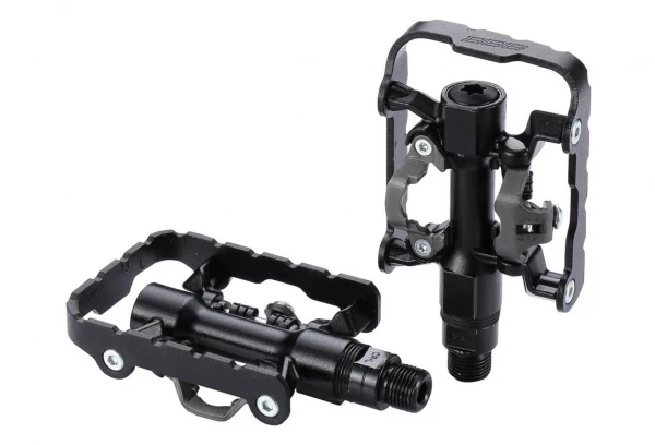 Pédale double fonction. Un côté à enclenchement compatible SPD, l’autre côté équipé d’une cage antiglisse en aluminium pour chaussures classiques.