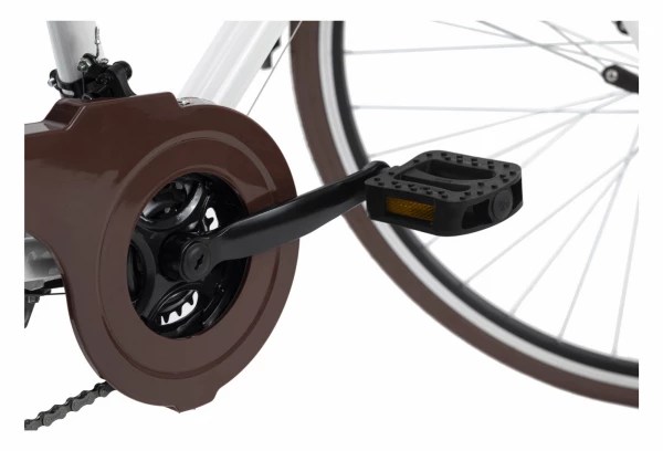 Avec son cadre blanc combiné à des détails élégants, il a un look particulièrement classe. De plus, les pneus, le protège-chaIne, la selle et les poignées sont de la même couleur et complètent le design.