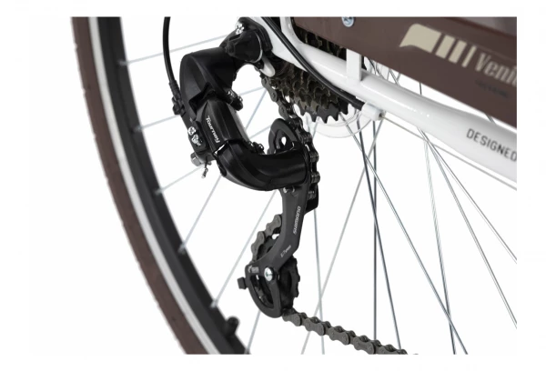 Pas de problème dans les montées avec les 21 vitesses du dérailleur SHIMANO. Let#39,inclinaison de la potence est réglable et, grâce à la selle suspendue, qui peut être réglée en fonction du poids du cycliste, les passages un peu accidentés seront amortis. Pour que chaque déplacement soit un plaisir!