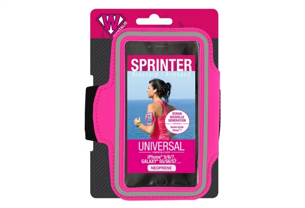 Courez en rythme avec le brassard pour smartphone Sprinter ! > Matière : Néoprène de haute qualité> Ajustable : Brassard velcro avec 2 positions de réglage pour ajuster le brassard à toutes les tailles de bras.> Poids : 46 grammes > Entretien : lavable en machine à 30degrésC.> Bandes réfléchissantesCourez en utilisant toutes les fonctions de votre smartphone : musique, application running, appel… votre téléphone reste à portée de main tout au long de votre course.Le brassard Sprinter est imperméable, il dispose de 5 fentes pour les fils d’écouteurs et le chargeur.Il est compatible avec tout smartphone (Iphone 5,6,7,8,X, Samsung galay S5 à S9, Sony Xperia…